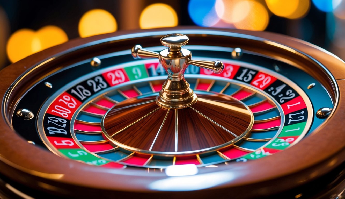 Roda roulette yang berputar dengan slot bernomor berwarna-warni dan sebuah bola perak kecil yang bergerak