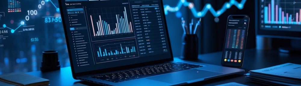 Meja kerja dengan laptop yang menampilkan data angka dan grafik, dikelilingi oleh buku catatan dan secangkir kopi di ruang kantor yang terang.