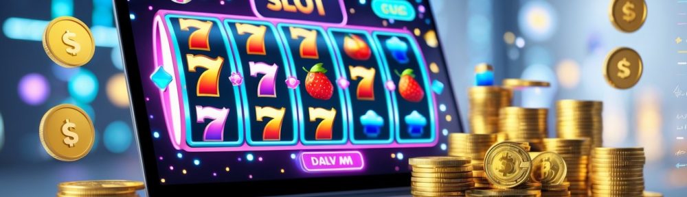 Sebuah laptop menampilkan permainan mesin slot online dengan koin emas dan tumpukan uang di sekitarnya, menggambarkan suasana permainan slot online resmi dengan bonus dan cashback.