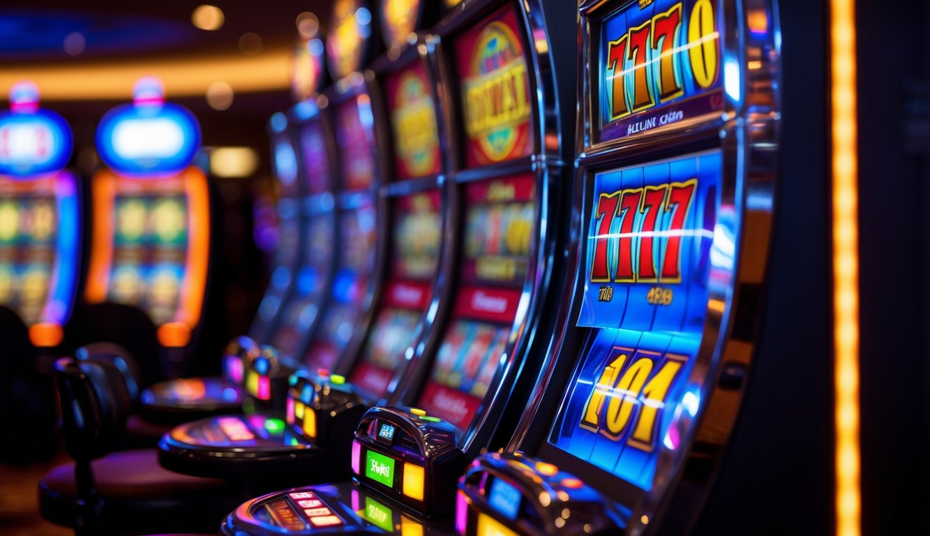 Mesin slot di kasino dengan pengaturan taruhan kecil, fokus pada tombol dan gulungan warna-warni.