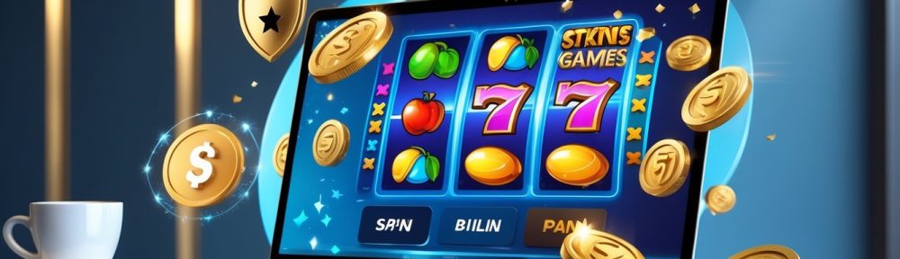 Seorang pengguna komputer dengan layar menampilkan permainan slot online berwarna cerah, di sekitar terdapat simbol koin dan ikon keamanan yang menunjukkan bonus dan kepercayaan.