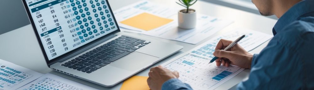 Seorang pria duduk di meja kerja dengan laptop dan kertas berisi angka-angka, sedang menganalisis data dengan serius.